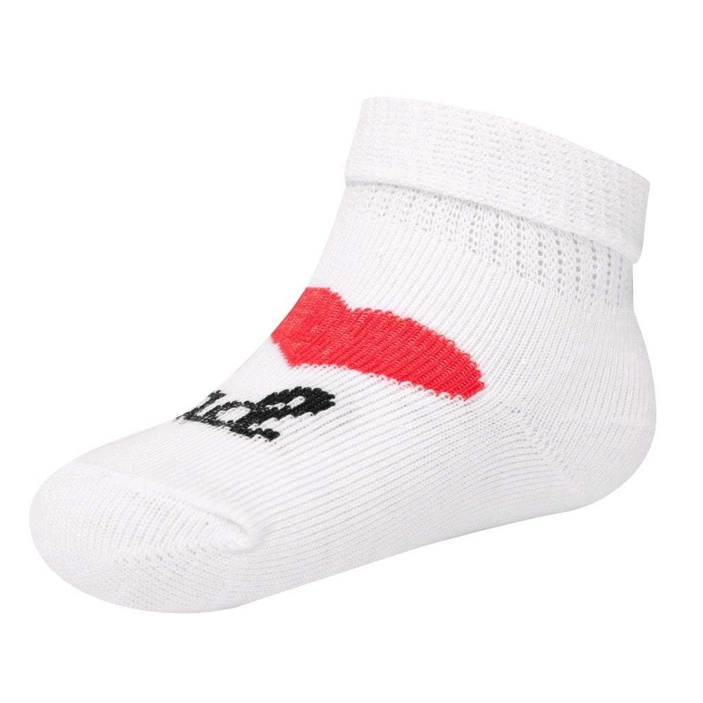 Aranyos baba zokni I ♥ Mum és I ♥ Dad motívummal, amely melegen és kényelmesen tartja a kis lábakat. A puha, rugalmas passzé nem szorít, lélegző kötésű, és a forma és színek tartósak a minőségi anyagnak köszönhetően. Ideális melegebb napokra és mindennapi viseletre.