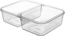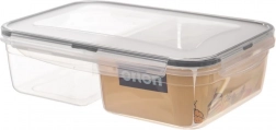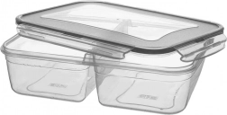 Praktikus, 2 literes, osztott ételtartó doboz masszív fedéllel, négy klippel és szilikon tömítéssel a tökéletes szivárgásmentességért. A két különálló rekesznek köszönhetően a ízek és illatok külön maradnak, BPA-mentes, alkalmas mosogatógépbe, mikrohullámú sütőbe (fedél nélkül), hűtőbe és fagyasztóba, és -25 °C-tól +95 °C-ig hőálló.