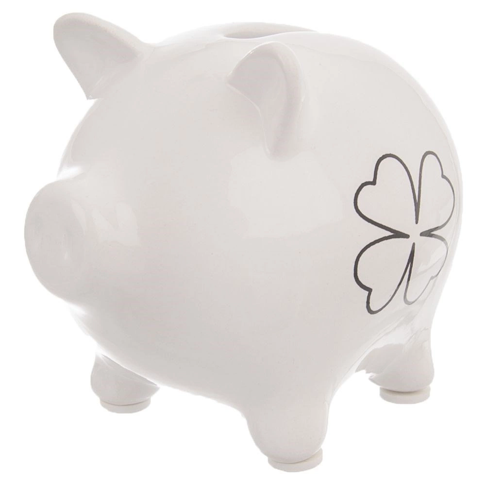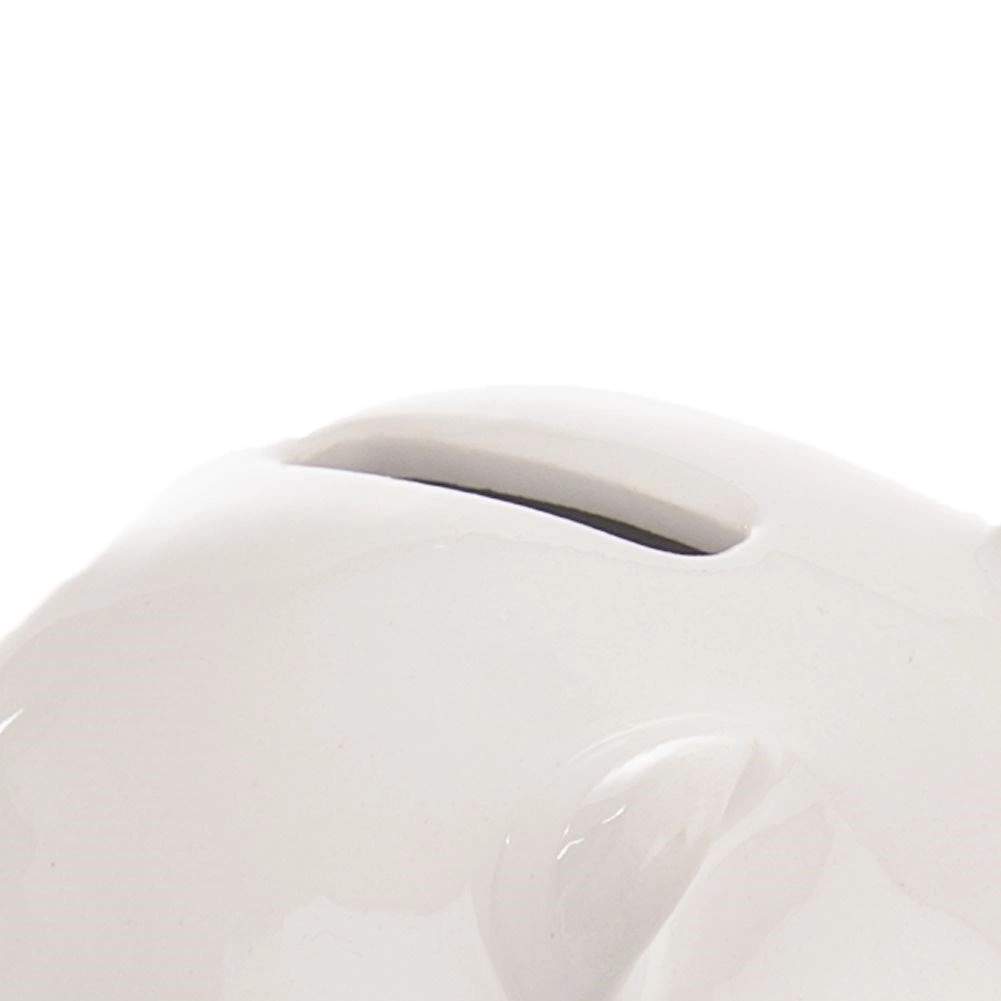Minimalista, fehér malacpersely finom lóherelevél-kontúrral, ideális a mindennapi érmék és bankjegyek gyűjtésére. A masszív kerámia és a simára égetett máz elegáns hatást kelt, és remekül illik gyerekszobába, irodába vagy nappaliba.