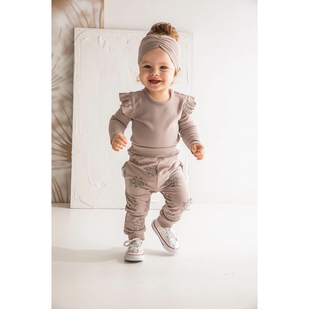 Az Ella kollekció melegítőnadrágjai a legkisebbek igényei szerint készültek. A minőségi pamut kötött anyag gyengéd az érzékeny bőrhöz, míg az elasztán rugalmasságot és szabad mozgást biztosít. A bézs szín visszafogott mintával könnyen kombinálható a gardrób más darabjaival.