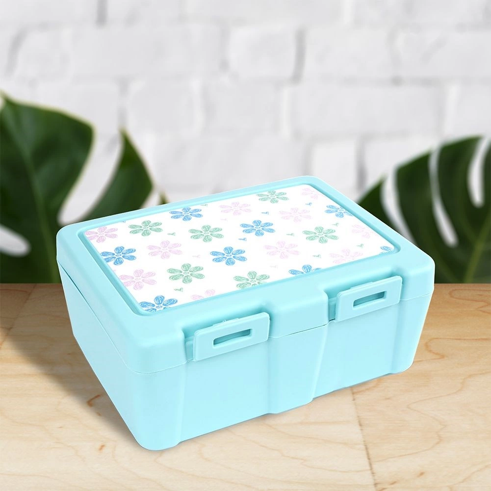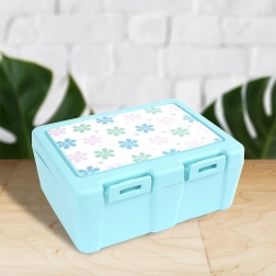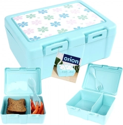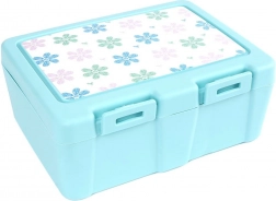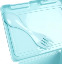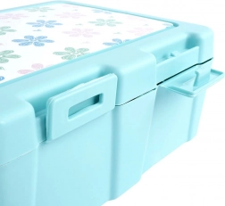 Stílusos, kék árnyalatú uzsonnás doboz virágmintás fedéllel, amely rendezetten elkülönítve és biztonságosan zárva tartja az ételeket. A belső elválasztó lap két zónát hoz létre különböző fogások számára, míg a praktikus 2 az 1-ben spork (kanál + villa) a fedél alatt kapott helyet, így mindig kéznél lesz.