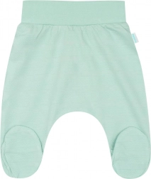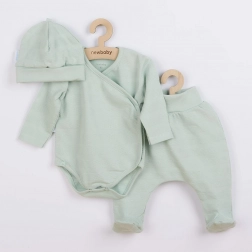 Ez a mentaszínű szett az újszülöttek kényelmét szem előtt tartva készült. A hosszú ujjú, teljesen elöl patentos body praktikus oldalsó záródással és lábrész közötti patentokkal rendelkezik a könnyű pelenkázásért. A félkezes nadrág derékban széles, rugalmas passzéval készül, amely nem nyomja a pocakot. A sapka szélesebb hajtókája jól tart, és nem nyomja a fejecskét.
