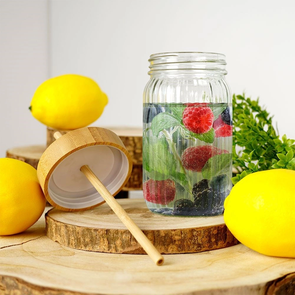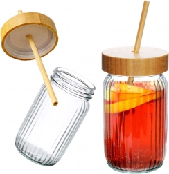 Ez az elegáns „mason” típusú üveg tumbler ötvözi a funkcionalitást és a természetes megjelenést. A bordázott, átlátszó üveg jól kézre áll, a menetes bambusz tető megbízhatóan zár, az újrahasználható bambusz szívószál pedig kényelmes kortyolást biztosít. Remek választás gyümölcsös vízhez, házi limonádékhoz, smoothie-hoz és jeges kávéhoz – otthon, a teraszon vagy a kertben.