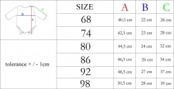 A body a szülők és a babák kényelmét szem előtt tartva készült: a praktikus patentok a vállon és a lábak között gyorsabbá teszik az öltöztetést és a pelenkázást. A stílusos minta játékos megjelenést kölcsönöz, amely könnyen összehangolható a többi babakelengyével.