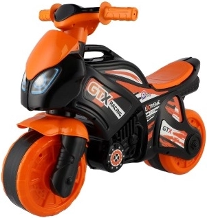 Gyermek futóbicikli motor sportos dizájnban minden gyors vezetést kedvelő kicsit megörvendeztet. A tartós műanyag szerkezet révén ideális szórakoztató és biztonságos játékhoz. A dizájn főként narancssárga-fekete, GTX Racing logókkal, amelyek a valódi versenymotor érzését keltik.