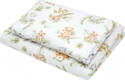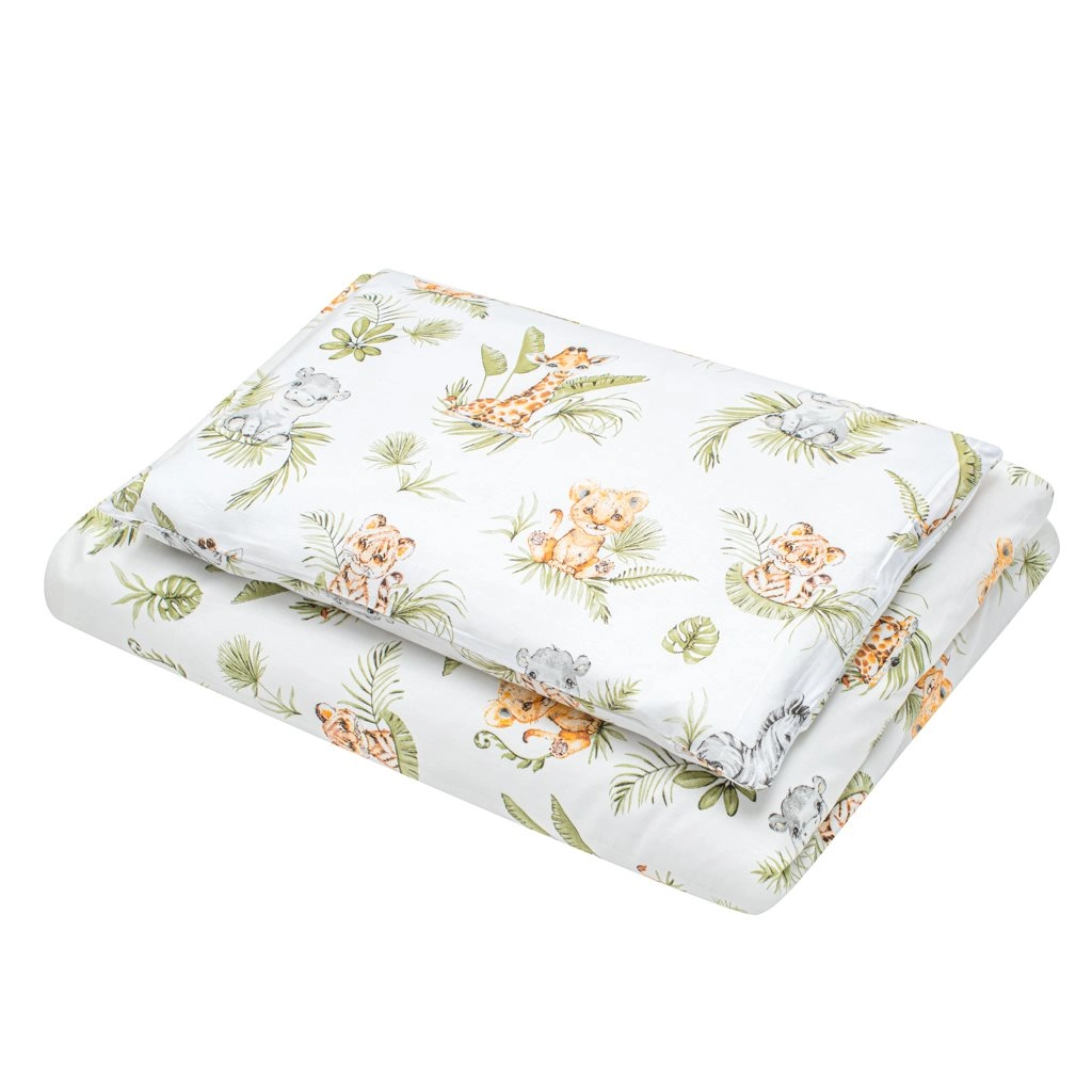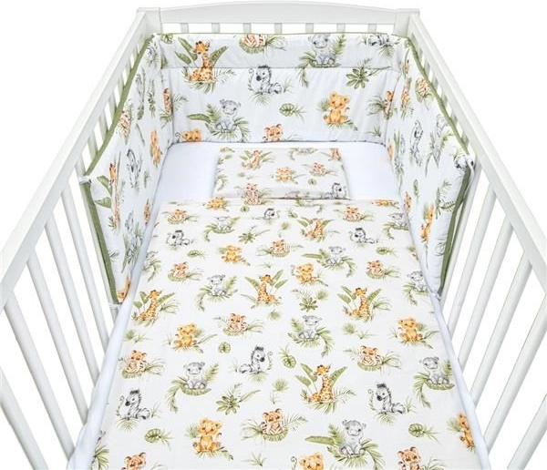 Aranyos, 3 részes kiságy ágyneműgarnitúra kellemes 100% pamutból, Jungle mintával, amely nyugodt és biztonságos alvást biztosít a babának. A szett tartalma: párnahuzat 40×60 cm, paplanhuzat 100×135 cm és rácsvédő 31×175 cm. Az anyagok kíméletesek a gyerekek bőréhez, színtartóak, és biztonságos cipzárral készülnek, szabadon lógó húzóka nélkül.
