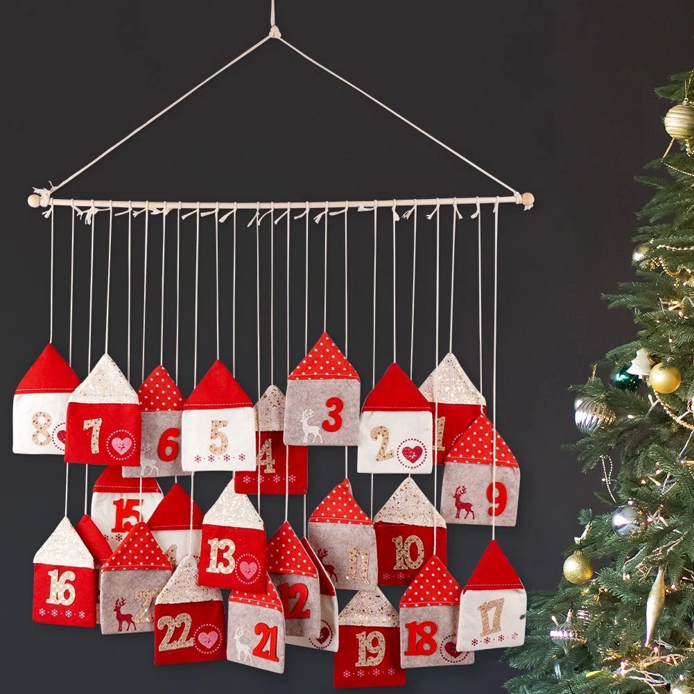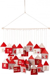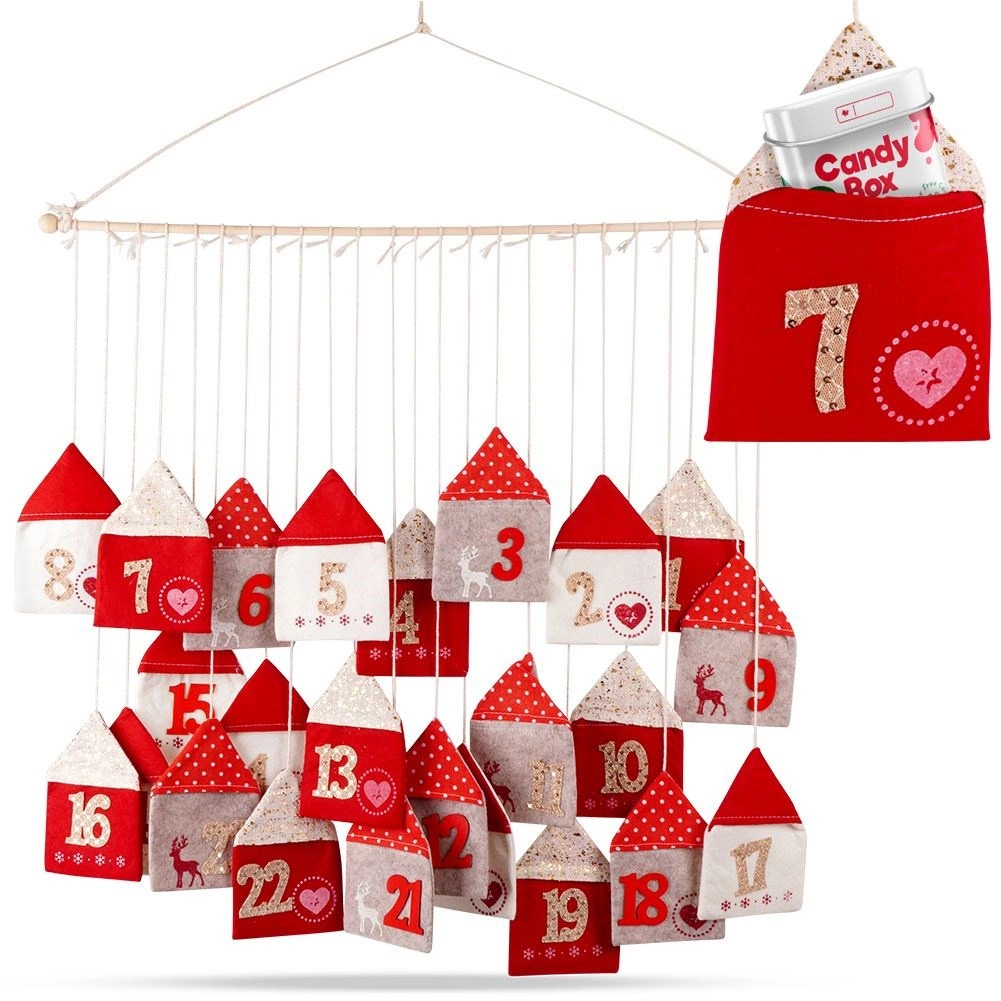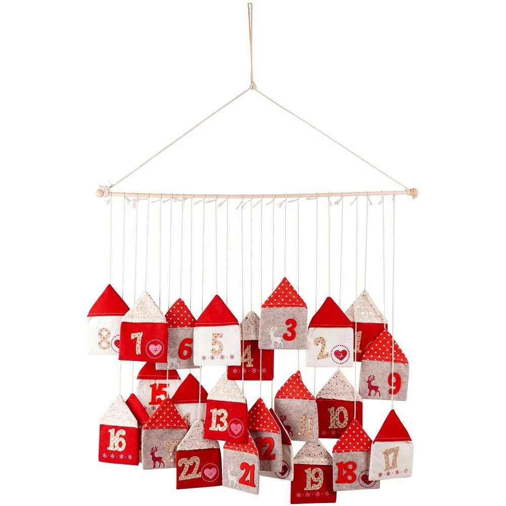 Ez a filc adventi naptár bájos házikóival, amelyek egy fa rúdon függnek, meleg, ünnepi dekorációt teremt bármelyik enteriőrben. A 70 × 60 cm méretnek köszönhetően szépen mutat falon, ajtón vagy a kandalló felett.