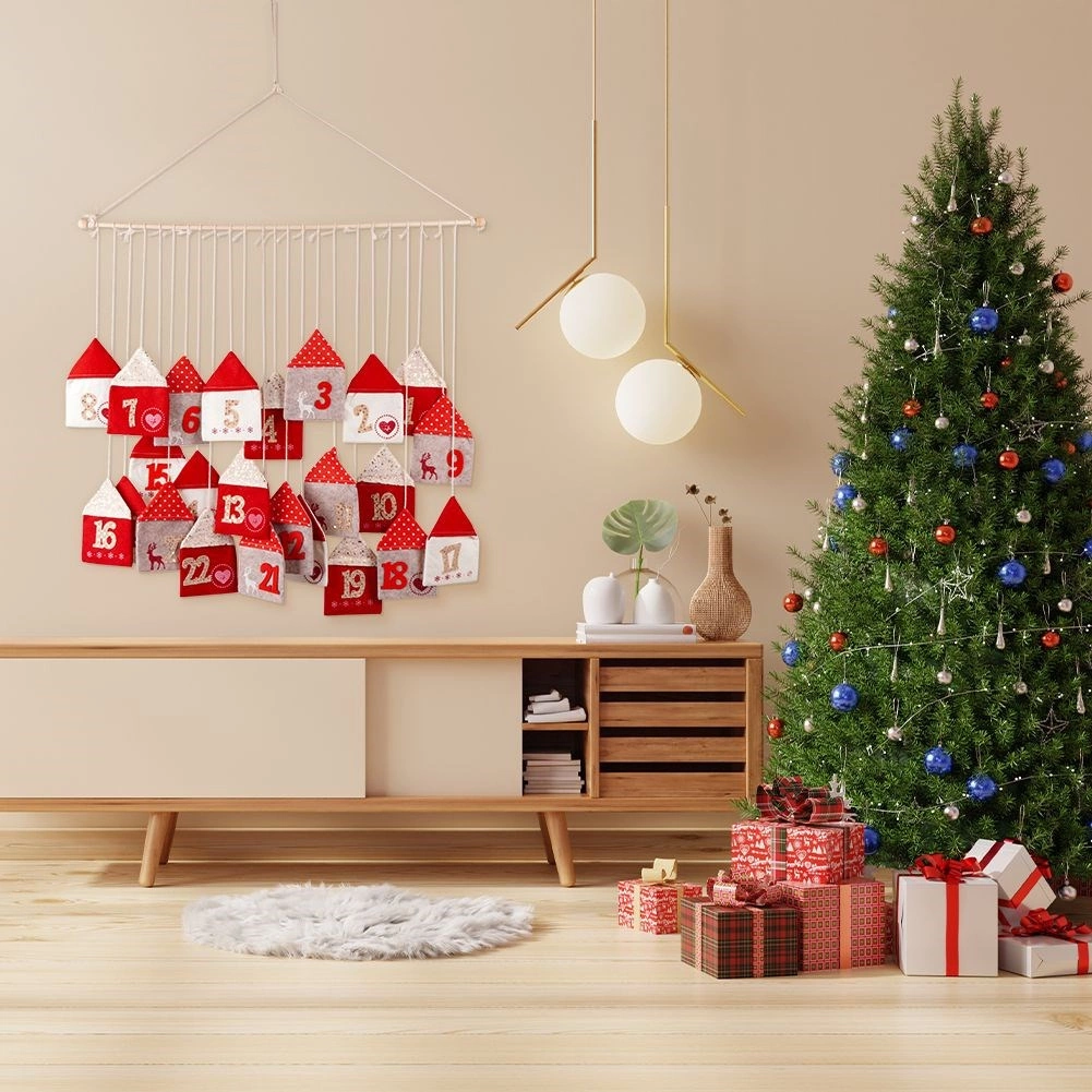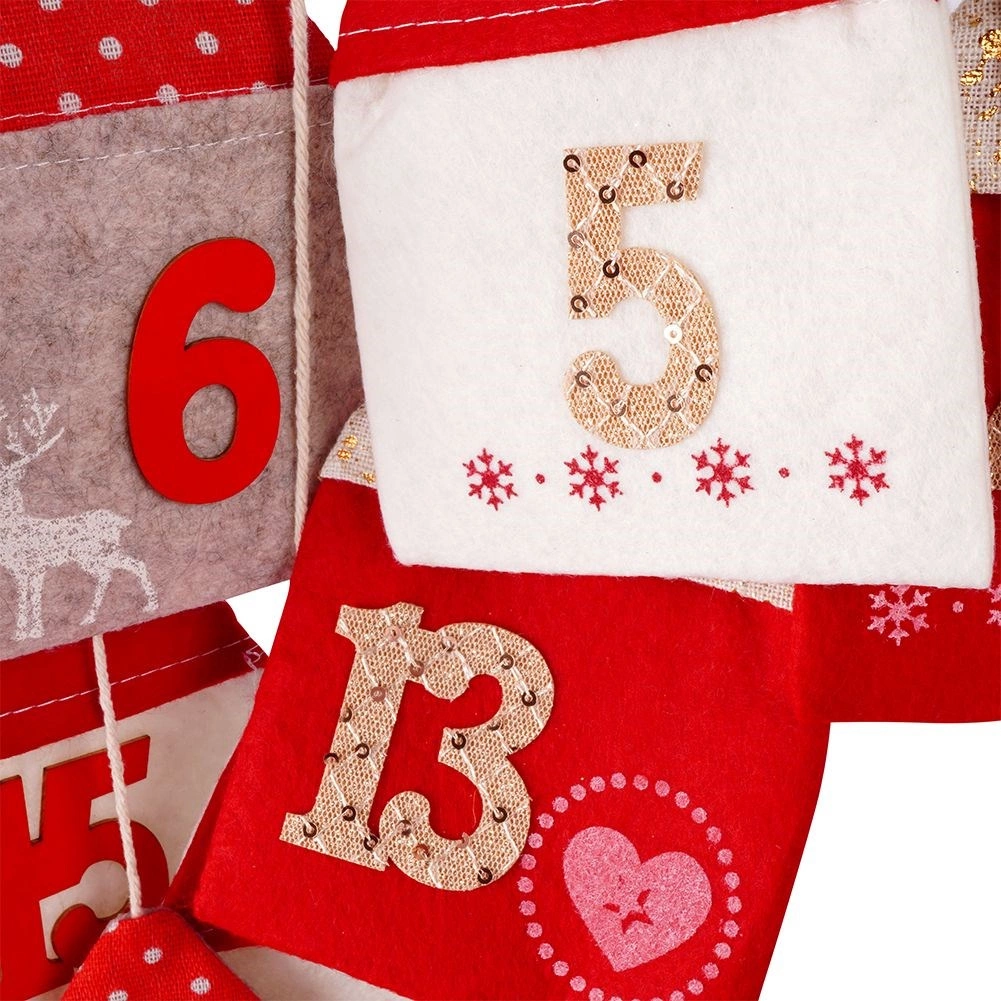 Kellemes tapintású textil, 1–24-ig számozva, ünnepi motívumokkal piros, fehér és bézs színekben, amelyek otthonos hangulatot kölcsönöznek a térnek.