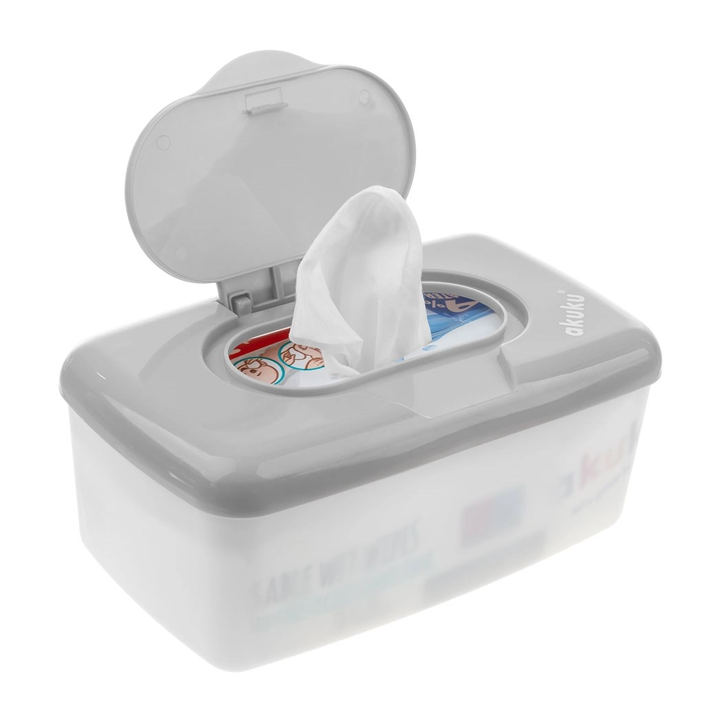 Az egyérintéses, praktikus nyitásnak köszönhetően akkor is könnyen kivehet egy kendőt, ha a karjában van a baba. A minimalista szürke dizájn illik bármely otthonba, és tökéletesen passzol az AKUKU törlőkendőkhöz.