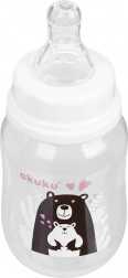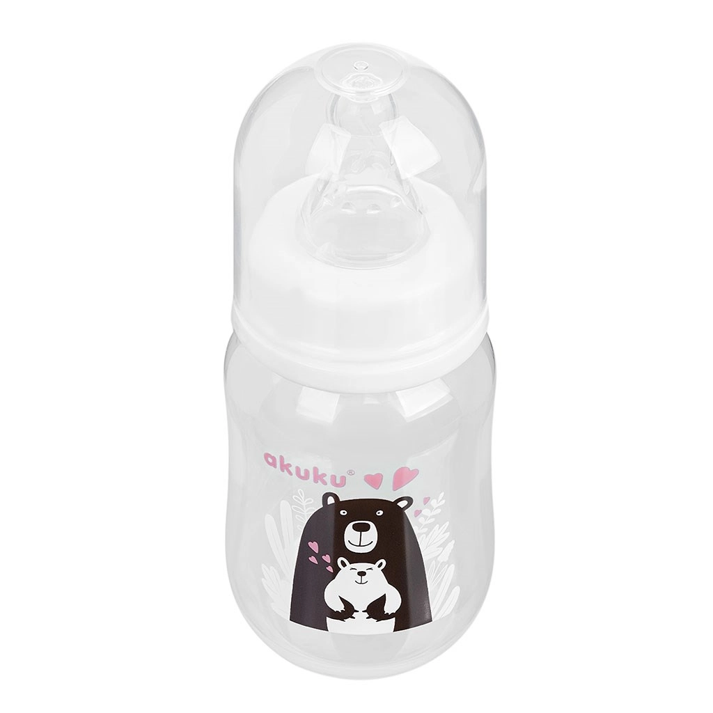 A fehér színű, 125 ml-es Akuku cumisüveg aranyos macimintával minden etetésnél kényelmet és biztonságot nyújt. A keskeny nyaknak és a formázott testnek köszönhetően kiválóan illeszkedik a kézbe, könnyű és praktikus a szülők és gondozók számára. A szilikon, kerek, lassú átfolyású cumi kíméletes a legkisebbekhez, 0 hónapos kortól alkalmas.