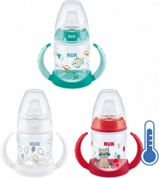 A NUK tanulópalack segíti a 6–18 hónapos gyermekeket az önálló ivás első lépéseiben. A beépített hőmérséklet‑indikátor kékesre/fehérre vált az ital hőmérsékletétől függően, így biztos lehet benne, hogy a folyadék nem túl forró. A puha szilikon itatórész kíméletes az érzékeny ínyhez, ugyanakkor cseppmentes, így minimálisra csökkenti a kifolyást otthon és útközben.
