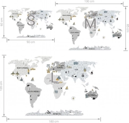 A matrica speciális matt laminátummal készül, amely növeli a karcállóságot, megkönnyíti a falra helyezést, és elegáns, tükröződésmentes megjelenést biztosít. A végső kompozíció mérete felragasztás után mérhető – a kontinensek a helyiség méretéhez igazítva elrendezhetők.