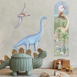 A pasztell dinoszaurusz‑illusztrációk barátságos, inspiráló helyszínné varázsolják a szobát játékhoz és pihenéshez.