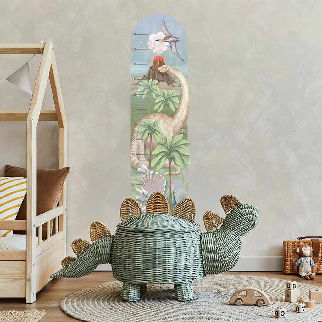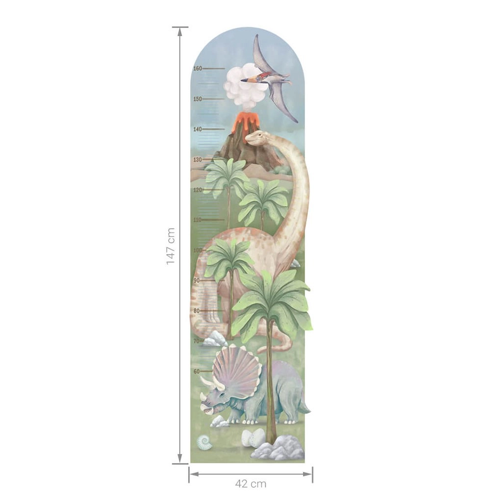 Ez a dizájnos falmatrica dinoszauruszos motívummal kalandos jura tájjá alakítja a gyerekszobát, miközben funkcionális magasságmérőt 50–160 cm tartományban is kínál. A minőségi, finom pasztell tónusú nyomtatásnak és a gondos kidolgozásnak köszönhetően kiváló a mindennapi használatra.