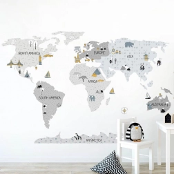 Ez a minőségi világtérkép finom szürke tónusokban remekül illik a modern gyerekszobai enteriőrökhöz. Az illusztrált kontinensek, állatok, hajók és nevezetességek támogatják a természetes kíváncsiságot, és játékosan fejlesztik a földrajzi ismereteket. Az egyes elemek körvonal mentén vannak kivágva, és külön-külön ragaszthatók, így a faladhoz igazodva pontosan beállíthatod a távolságokat.