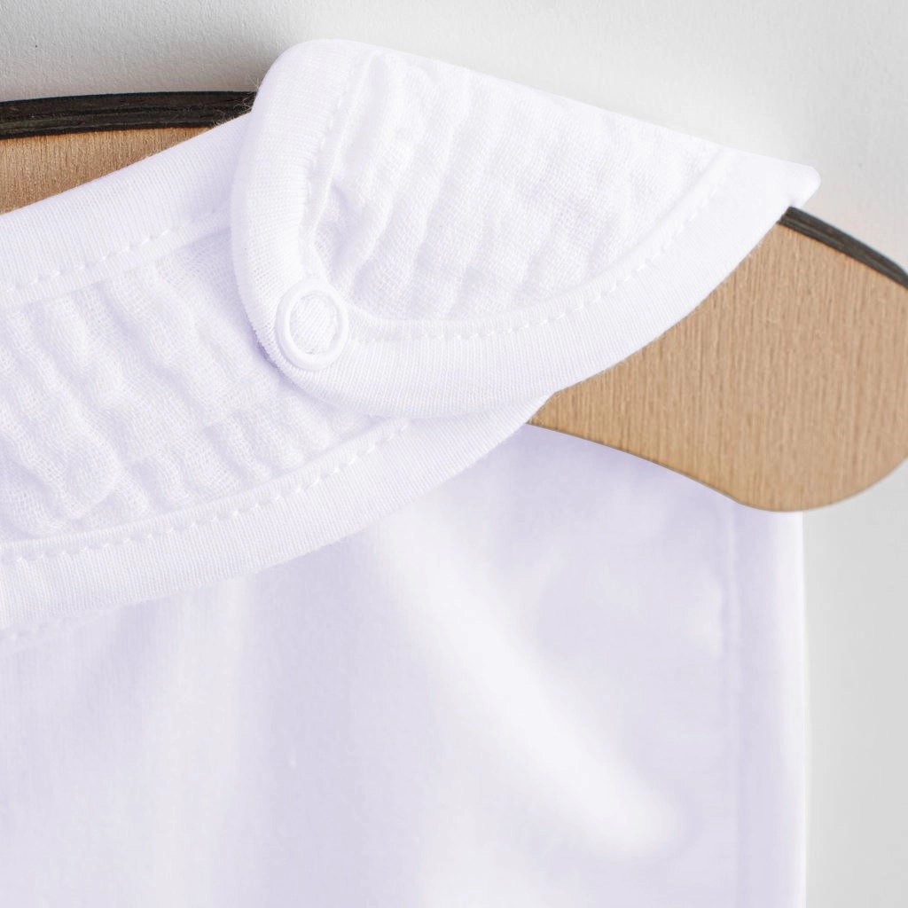 A NEW BABY Elizabeth muszlin előke ideális választás a mindennapi használatra. A könnyű, légies muszlin szerkezet lehetővé teszi, hogy az anyag „lélegezzen”, csökkentve a túlmelegedés kockázatát, miközben kényelmet biztosít a babának. A kétféle méretet kínáló praktikus patentos záródás tökéletes illeszkedést garantál a baba növekedéséhez.