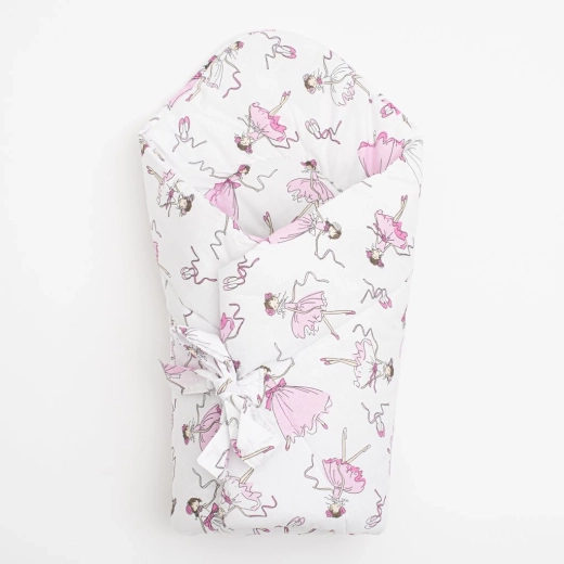 A balerina motívum gyengéd és megnyugtató hatású. A zsinóros megkötésnek köszönhetően a pólya könnyen a baba méretéhez igazítható. A hipoallergén töltet tiszta és egészséges környezetet biztosít, mikroorganizmusok és penész nélkül.