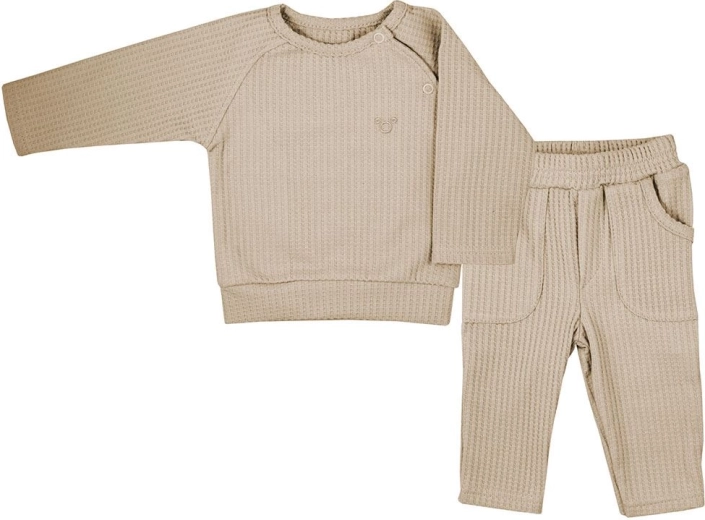 Stílusos, 2 részes KOALA Bello babaszett bézs színben, amely ötvözi a kényelmet és a modern megjelenést. Hosszú ujjú, patentos pólót és rugalmas derekú, zsebes melegítőnadrágot tartalmaz. Új, strukturált mintázatú anyagból a maximális kényelem és a szabad mozgás érdekében.