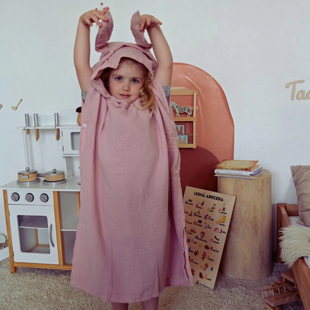 A könnyű és légáteresztő gyerek muszlin poncsó rózsaszín színben ideális fürdés után otthon, a medencénél és a vízparton. Szépen nedvszívó, gyengéd a gyermek bőréhez, és a bő szabásnak köszönhetően aranyos fülecskékkel együtt a gyermekkel nő. Az oldalsó patentok a könnyű öltözködéshez lehetővé teszik kéznyílás kialakítását vagy a bő szabás meghagyását.