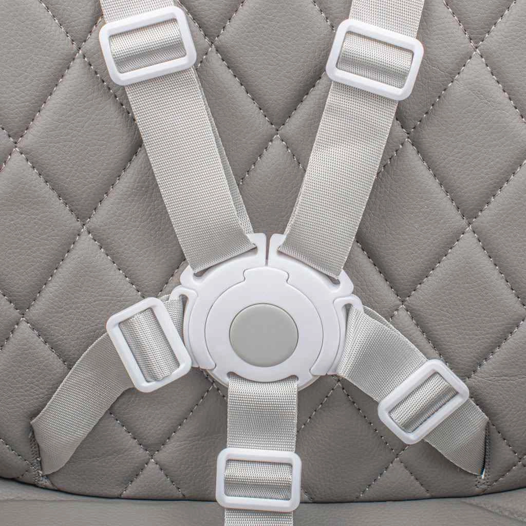 A puha ökobőr kárpit, az oldalsó megtámasztás és az 5 pontos övek stabilitást és biztonságot nyújtanak a gyermeknek minden étkezésnél.