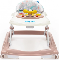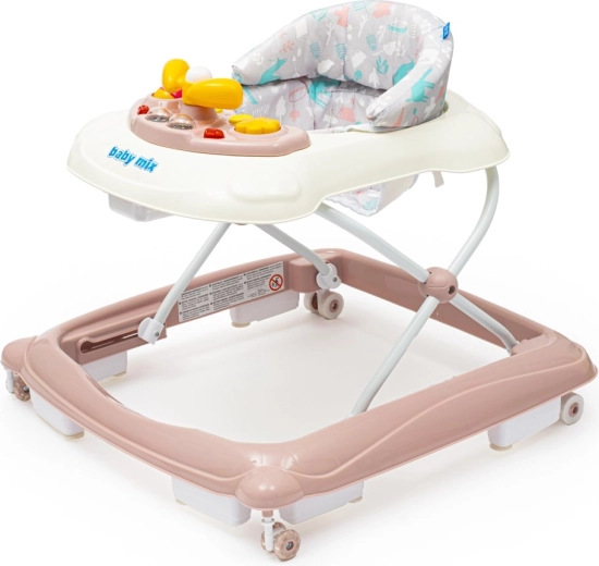A BABY MIX járássegítőt 6 hónapos kortól ajánljuk; a szórakozást biztonságos támogatással ötvözi a járás tanulásában. A multimédiás panel fényhatásokkal, dudával és forgatható kormánnyal aktív játékra motivál, fejleszti a finommotorikát és az érzékelést. A kényelmes párnázású ülőrész könnyen levehető és mosható, így a karbantartás egyszerű.