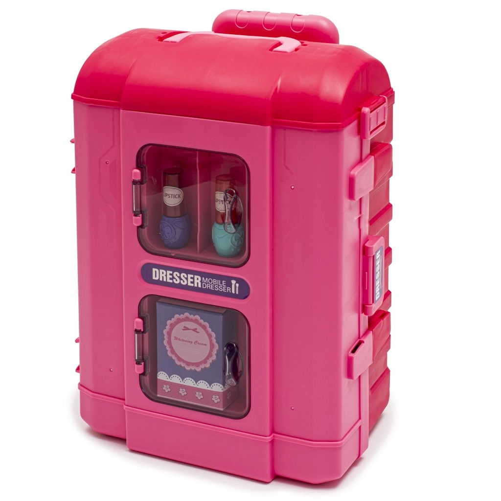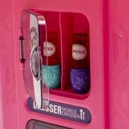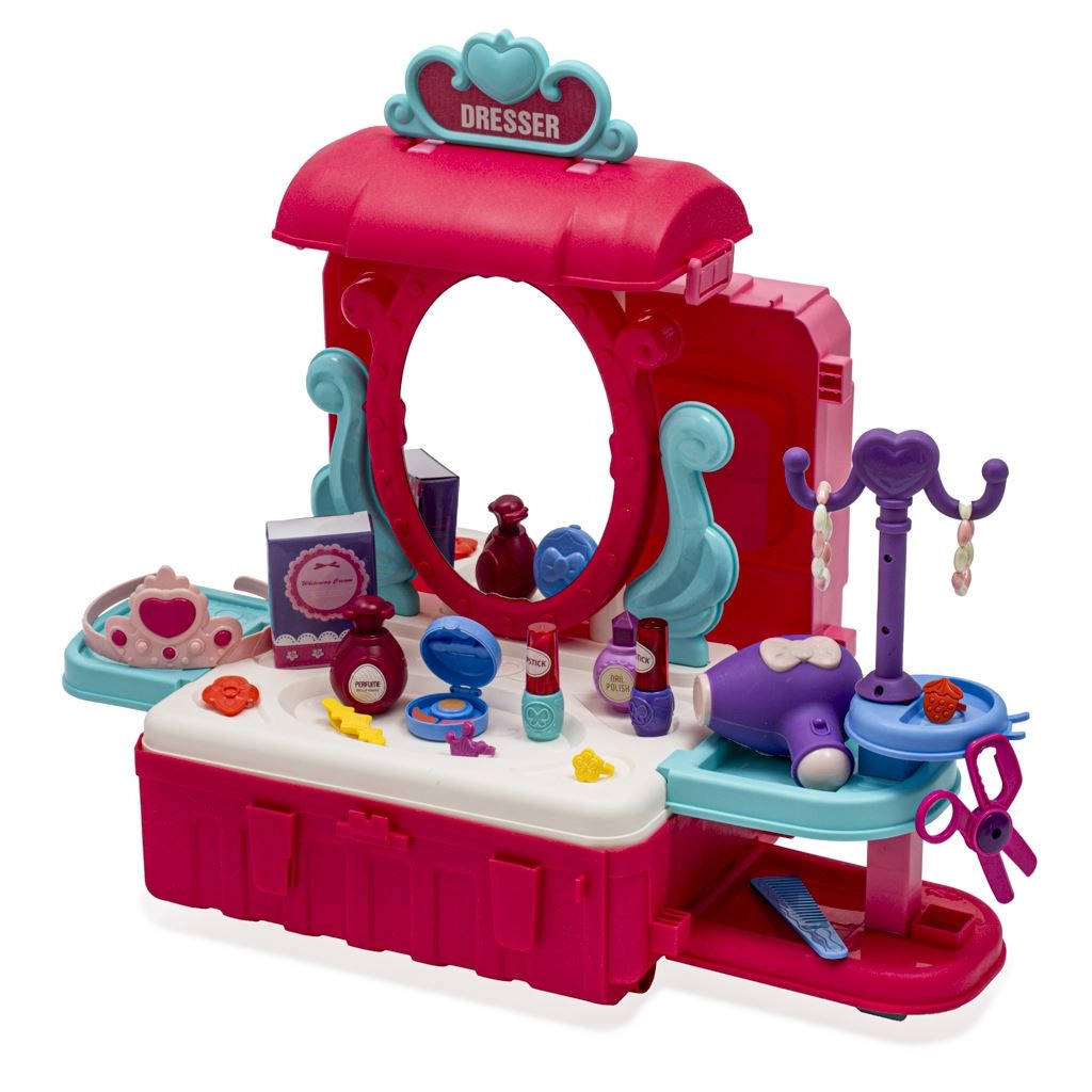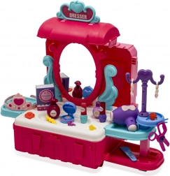 A 3 az 1-ben gyerek kozmetikai szett mindent kínál a mindennapi megjelenés ápolásának vidám utánzásához. A hordozható bőröndből ovális tükörrel ellátott toalettasztallá alakul, számos kiegészítővel, mint korona, „parfümök”, rúzs, fésű, hajszárító és ékszertartó. A kis parádésok így fejleszthetik finommotorikájukat, képzelőerejüket és szociális készségeiket a szépségszalonos szerepjátékban.