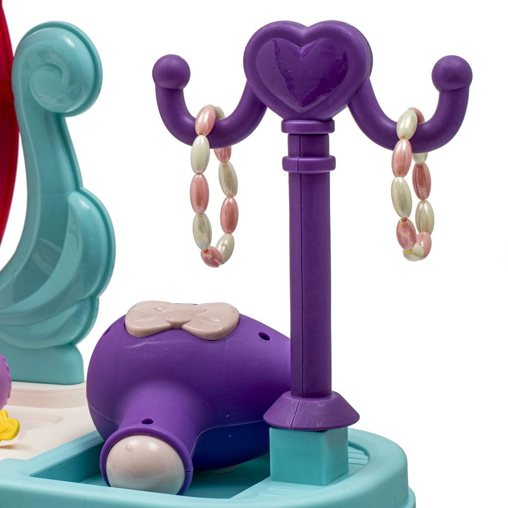 Nagy ovális tükör, munkafelület és gazdag tartozékkészlet (tiara, „parfümök”, rúzs, hajszárító, fésű) teremtenek autentikus szépségszalont a mindennapi játékhoz.