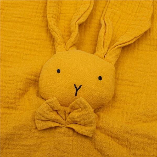 Puha muszlin alvókendő New Baby Rabbit mustársárga színben – ideális első kis kedvenc a babának. 100% organikus pamutból készült, lágy töltettel, és segít megteremteni a biztonságérzetet és a nyugodt elalvást. Minimalista dizájnja és finom színei remekül illenek bármely babakelengyéhez, és jól harmonizálnak más muszlin termékekkel.