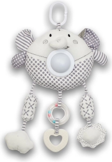 A legkisebbeket elbűvöli ez az aranyos kis elefánt finom fényekkel, megnyugtató dallamokkal és kellemes rezgéssel. A műanyag klipnek köszönhetően könnyen rögzíthető a babakocsira vagy az autósülésre, és a babát lekötik a színes rágókák, a fény, a zene és a rezgő hatás.