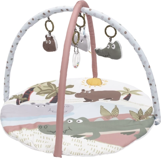 A Baby Mix Sahara Animals játszószőnyeg kellemes és ingergazdag környezetet teremt 3 hónapos kortól. Puha, selymes felülete ideális az első hason fekvős gyakorláshoz és a háton pihenéshez is. A levehető fejpárna növeli a kényelmet, a függesztett játékok pedig bármikor levehetők és a szőnyegen kívül is használhatók.