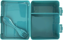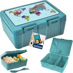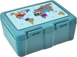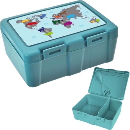 A két praktikus rekesz lehetővé teszi a főétel és a köretek vagy gyümölcsök elkülönítését. Az erős oldalsó klipszek megakadályozzák a véletlen kinyílást és a tartalom kiszóródását, így számíthat egy tiszta hátizsákra vagy táskára. A vonzó, türkiz dizájn világtérképpel és állatokkal egészségesebb uzsonnákra ösztönöz, és kicsiknek-nagyoknak egyaránt tetszik.