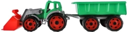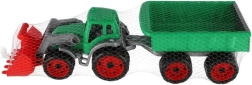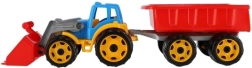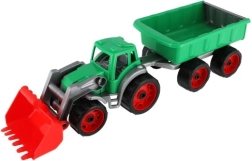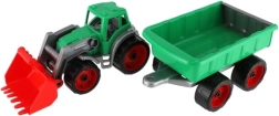 Színes műanyag traktor rakodóval és utánfutóval ideális játék kisgazdáknak. Kiváló minőségű és tartós műanyagból készült, hosszú szórakozást kínál nemcsak a homokozóban.
