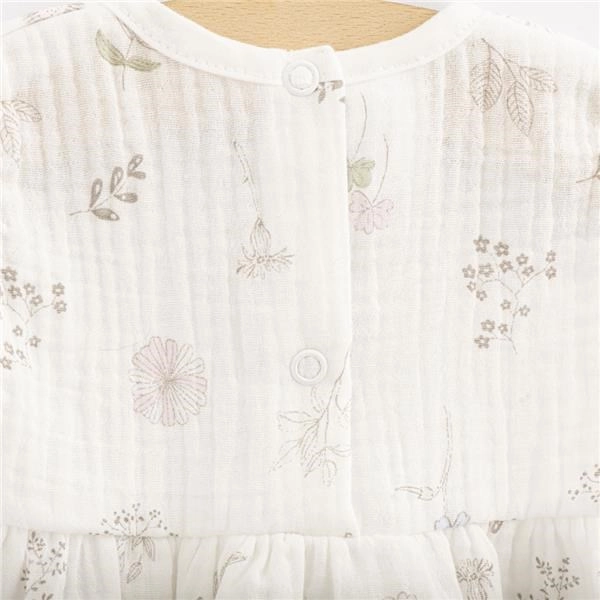A hátul található pattentos záródás megkönnyíti az öltöztetést és a levetést. A 100% pamut muszlin tartósságáról ismert – mosás után még puhább és kellemesebb tapintású lesz. Ez a kis ruha remek választás nyári sétákhoz, látogatásokhoz és fotózásokhoz.