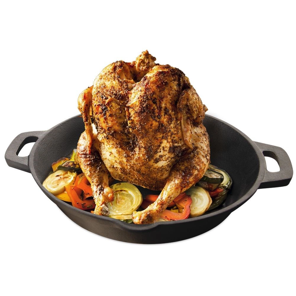 Ez a masszív öntöttvas serpenyő integrált állvánnyal a tökéletes sült csirkéhez készült – akár „sör a csirke alatt” stílusban is. A középső tüske sörrel vagy borral tölthető a plusz szaftosságért és aromáért, körülötte pedig kényelmesen elfér a burgonya vagy a zöldség. Az öntöttvas egyenletes hőeloszlást biztosít és sokáig tartja a hőt, így az étel tovább marad meleg.