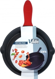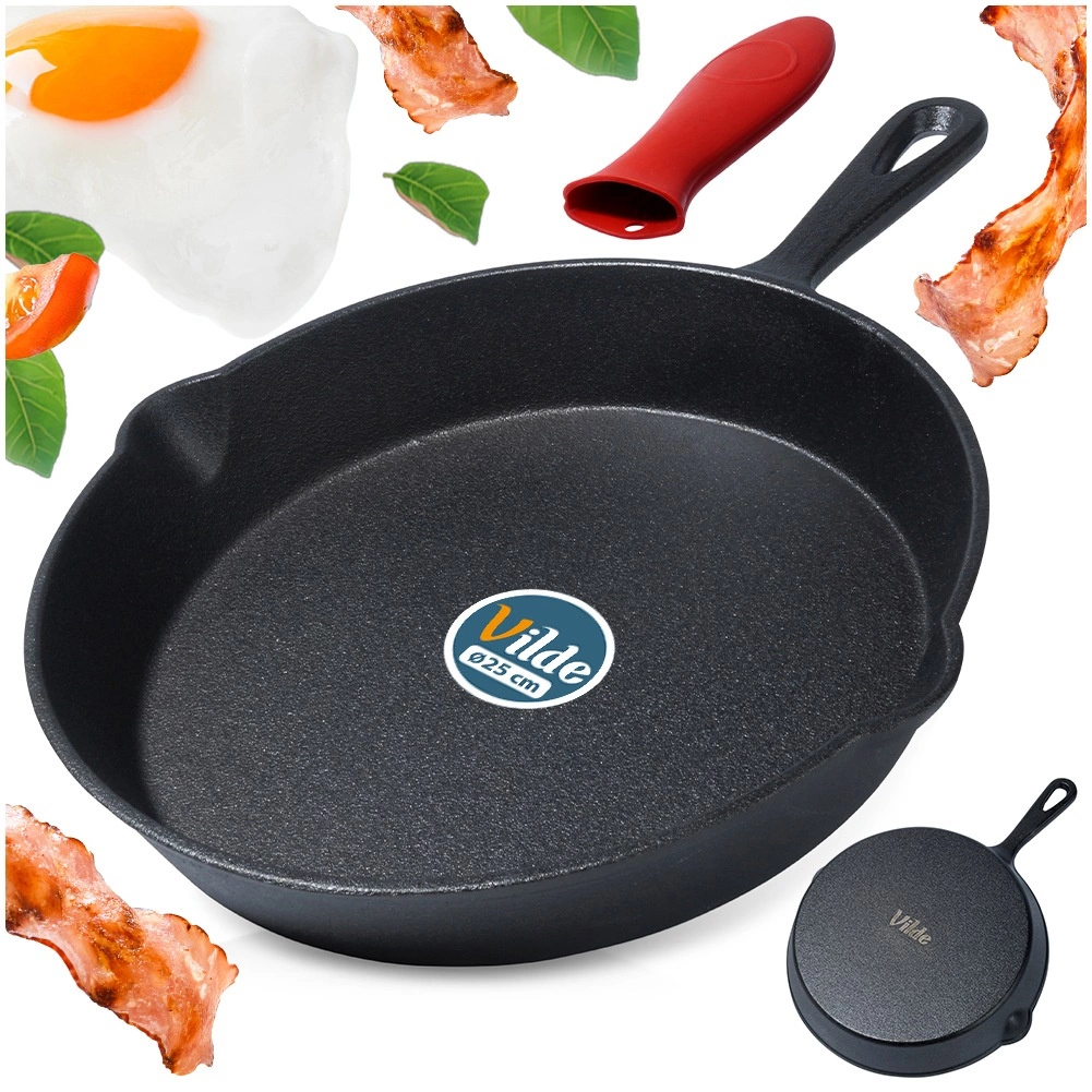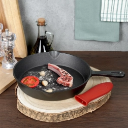 A csomag része egy piros szilikon huzat is a forró nyél biztonságos megfogásához. A serpenyő minden tűzhelytípushoz, köztük az indukcióhoz is alkalmas, betehető a sütőbe, használható a grillen és közvetlenül nyílt tűz fölött is – ideális a konyhába, kempingezéshez és kerti grillezéshez.