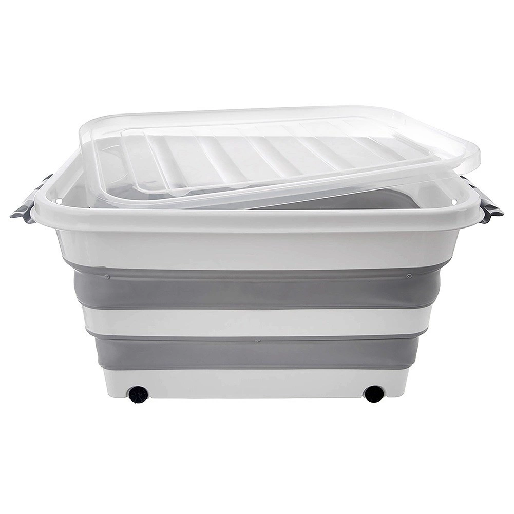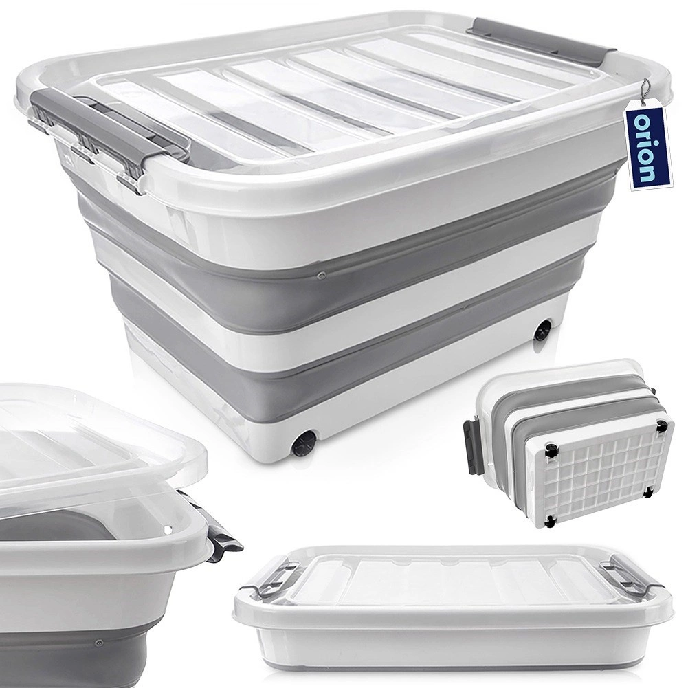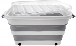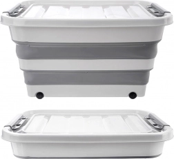 Praktikus, 30 l űrtartalmú, kerekekkel és átlátszó fedéllel ellátott összecsukható tárolódoboz az otthon könnyű rendszerezéséhez. Összecsukható kialakítása helyet takarít meg, masszív fedélzárakkal rendelkezik, és tartós anyagokból készült. Textíliákhoz, játékokhoz, ruhákhoz és könyvekhez is alkalmas. Könnyen mozgatható a kerekeknek köszönhetően, összecsukható design, biztonságos zárás és sokoldalú felhasználás.