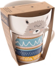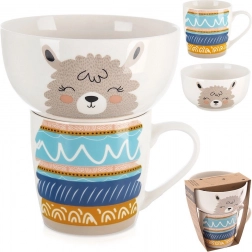 A bögre és a tál együtt egy láma képét alkotják. A játékos minta segít örömet találni az evésben, és kellemesebbé teszi minden étkezést.