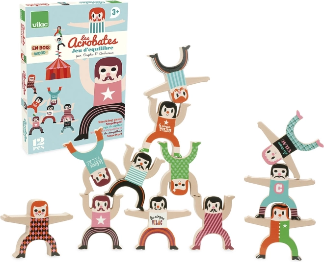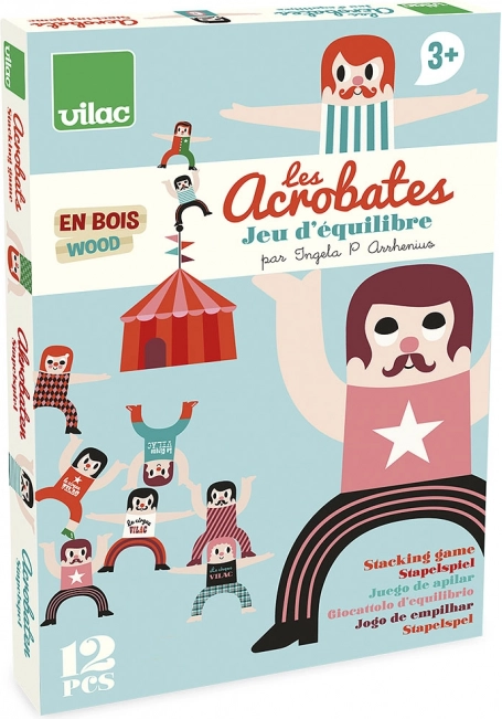 A VILAC márka tizenkét fából készült akrobatából álló vidám készlete okos egyensúlyozó játékot kínál az egész családnak. A gyerekek és a felnőttek lelkesen rakják egymásra a figurákat, és próbálnak ki különféle formációkat. A játék fejleszti a türelmet, a logikus gondolkodást, a finommotorikát és a kreativitást. Az eredeti megjelenést Ingela P. Arrhenius illusztrációi garantálják.