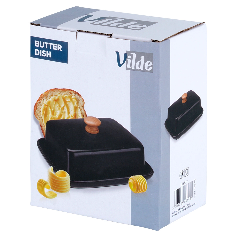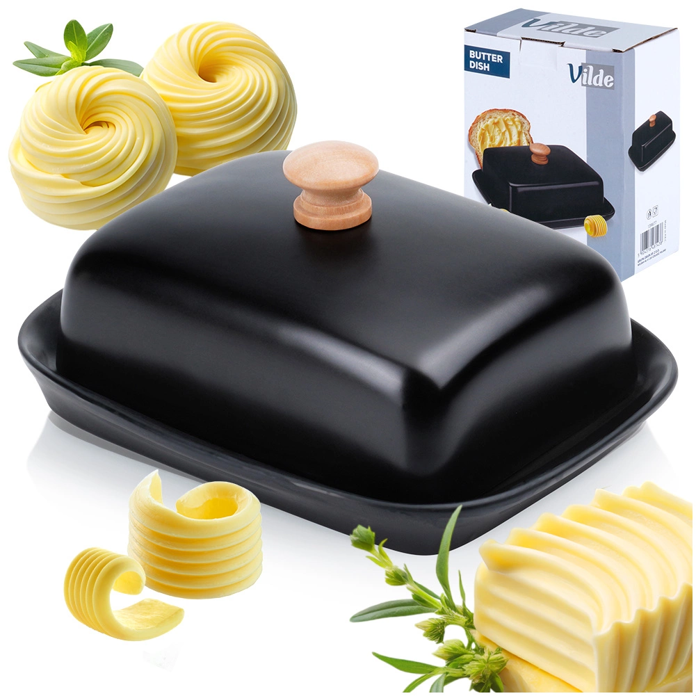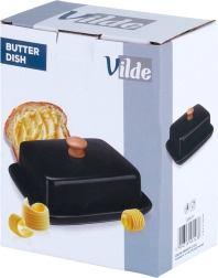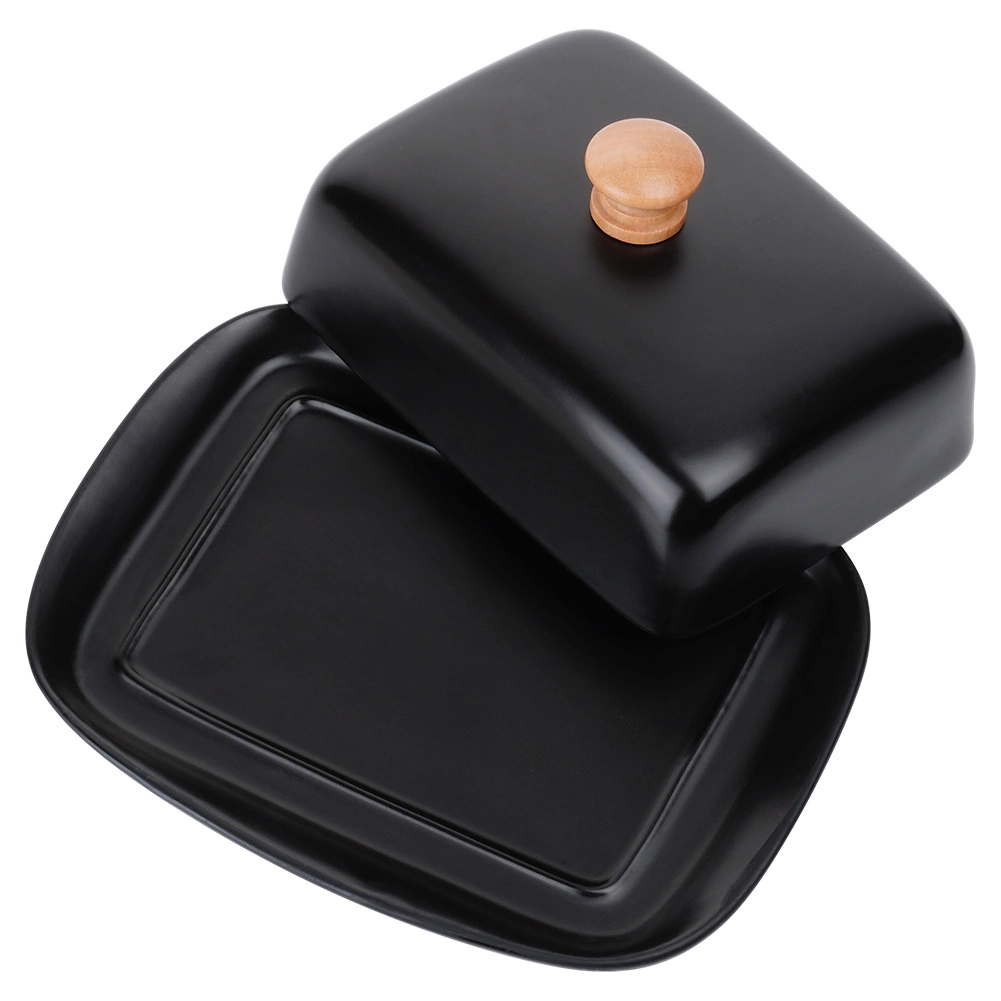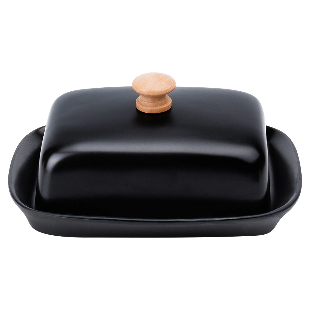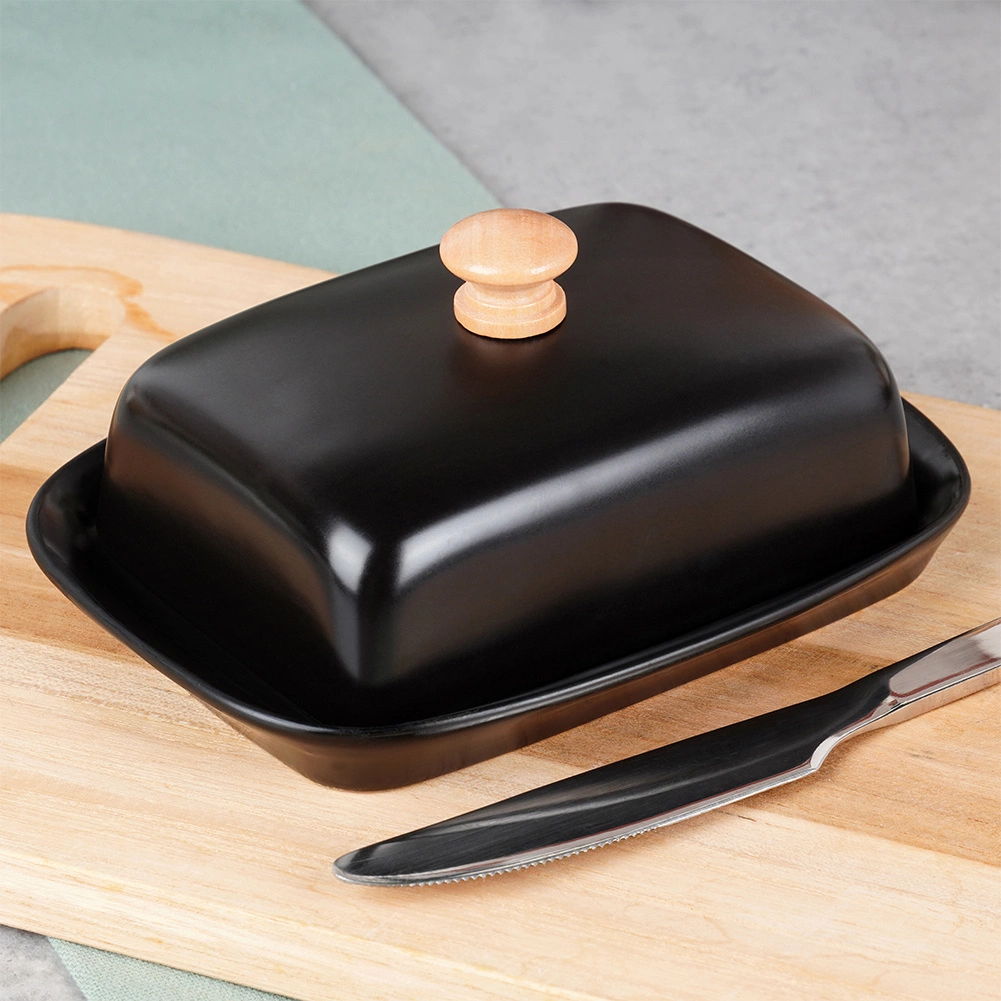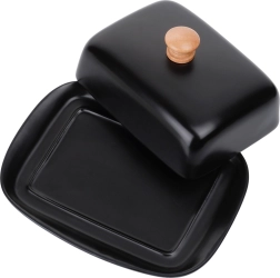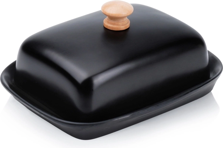 Ez a stílusos, fekete kivitelű, minőségi kerámiából készült vajtartó ideális a mindennapi használatra otthon és az asztali tálaláshoz egyaránt. A fedélen lévő fa fogantyú kényelmes emelést tesz lehetővé, míg a szorosan illeszkedő fedél megóvja a vajat a kiszáradástól és az idegen szagoktól.