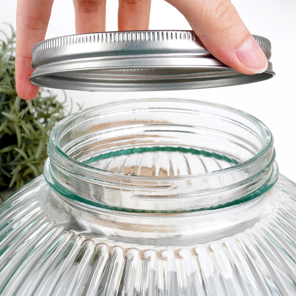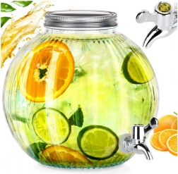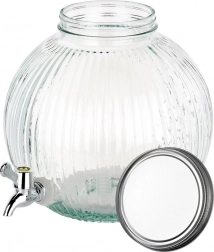 Elegáns, 5,5 l űrtartalmú üveg italadagoló fém fedéllel és praktikus csappal, ideális limonádé, gyümölcsös víz, puncs vagy jeges tea tálalásához. Masszív bordázott üveg, széles nyak a könnyű töltéshez és tisztításhoz, valamint csavaros fedél a rovarok ellen – tökéletes választás kerti partikra és otthoni ünnepségekre.