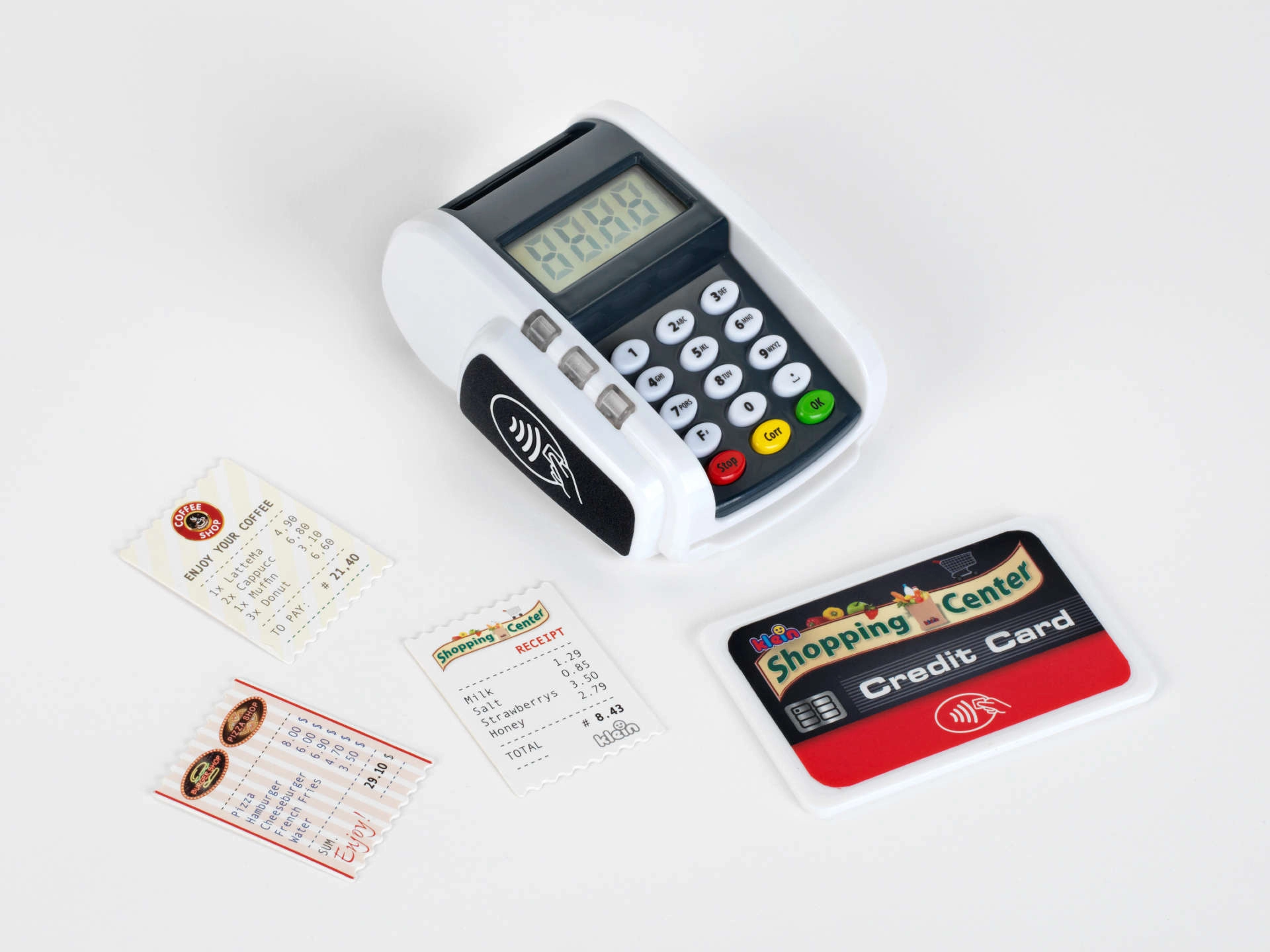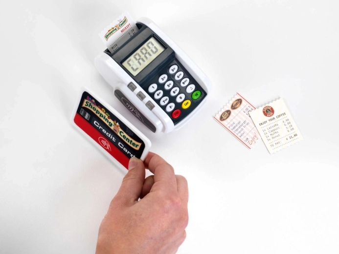 A gyerekek kipróbálhatják a kártya érintését és a billentyűzet nyomogatását – ideális a pénztáros szerepjátékhoz.