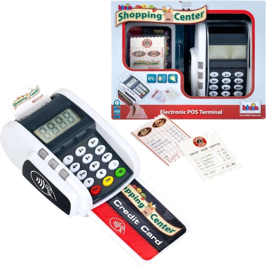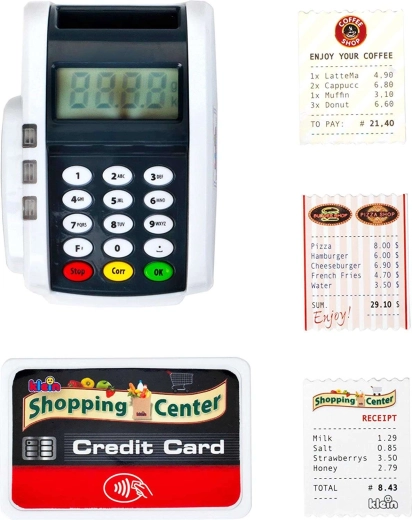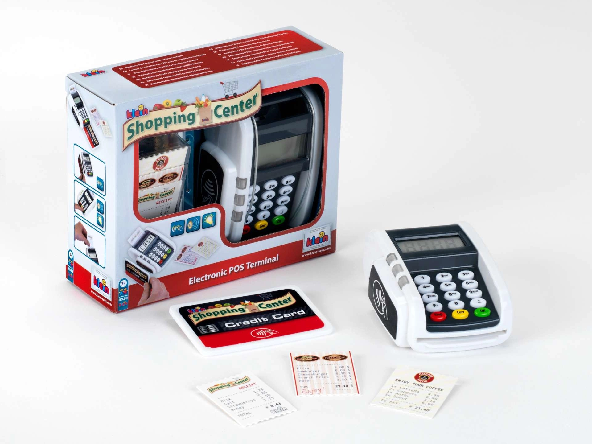 A KLEIN márka élethű gyermek fizetési terminálja pénztárhoz hasonló szórakozást nyújt. Funkcionális gombokkal, érintésmentes fizetésolvasóval, fény- és hanghatásokkal rendelkezik, és játékos formában fejleszti a gyerekek képzeletét bolt- vagy éttermes szerepjáték közben.
