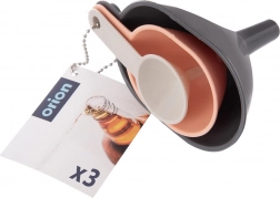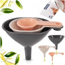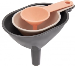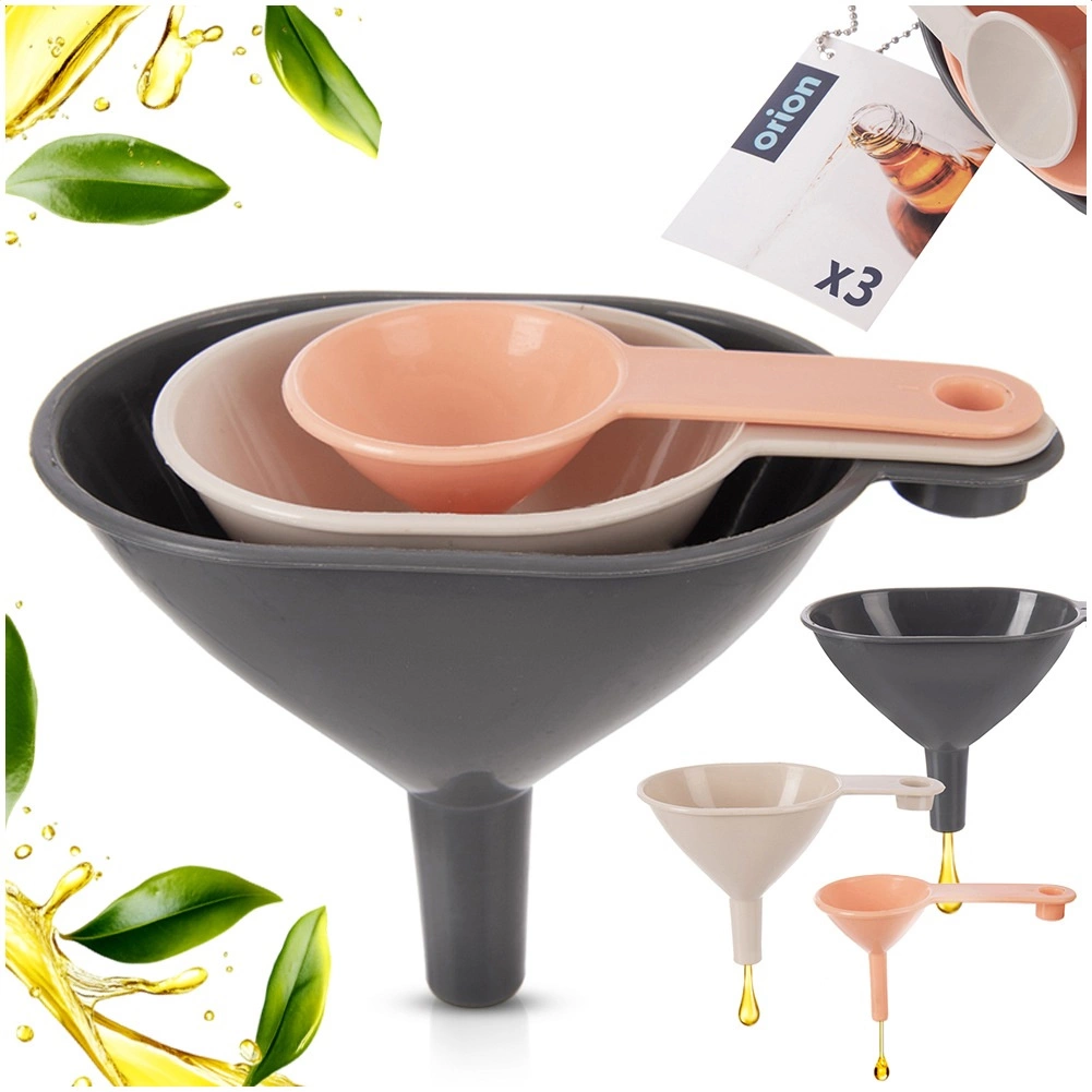 Egyszerűsítse a mindennapi főzést és a házi befőzést ezzel a három, praktikus méretben kapható tölcsérből álló készlettel. A keskenyedő kiömlőknek és a kényelmes fogóknak köszönhetően olajat, szirupot vagy bort, illetve cukrot, sót vagy apró magokat is könnyedén átönthet, illetve beönthet keskeny nyakú edényekbe kiömlés és kiszóródás nélkül. A kompakt méretek és a stapelhető kialakítás helyet spórol a konyhában.