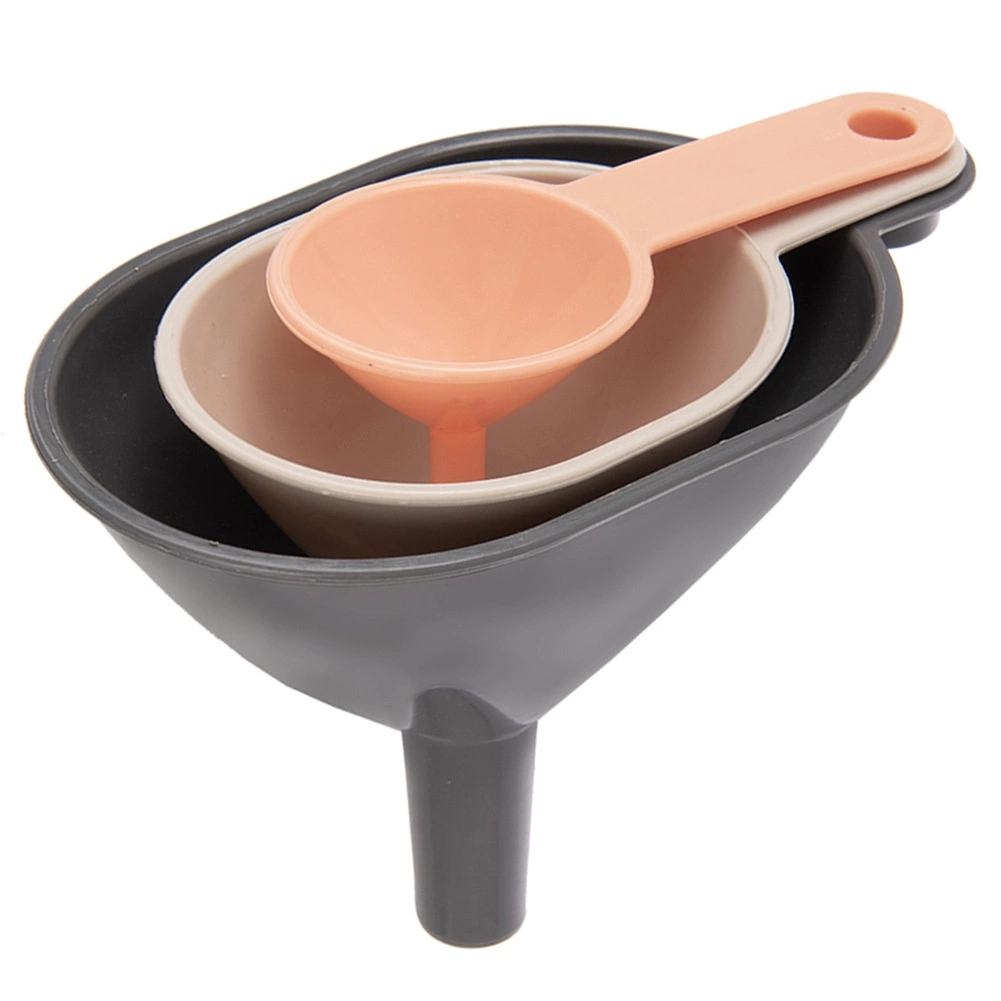 Kis, közepes és nagy tölcsér a folyadékok és szemes alapanyagok átöntéséhez különböző szélességű nyakú edényekbe.
