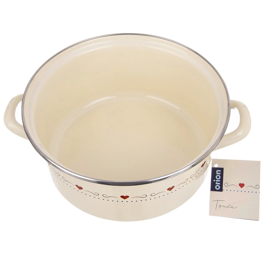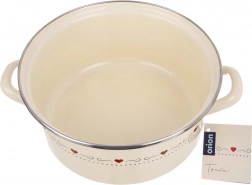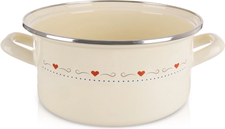 Elegáns, krém színű 4 l űrtartalmú zománcozott fazék finom szívecskés mintával, ideális a mindennapi ételek főzéséhez és párolásához. A minőségi zománcozott acél, a rozsdamentes perem és a masszív, ergonomikus fülek tartósságot, biztos fogást és könnyű tisztítást kínálnak. Alkalmas minden tűzhelytípushoz, beleértve az indukciót, valamint sütőbe is tehető, és mosogatógépben mosható.