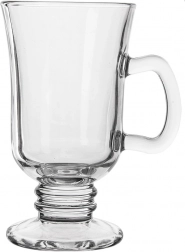 Ez a magas, füllel és díszes talppal ellátott pohár exkluzív megjelenést kölcsönöz a meleg italoknak. Az átlátszó üveg kiemeli a latte rétegzettségét és a latte art díszítést, míg a széles, stabil alap biztonságos felszolgálást biztosít.