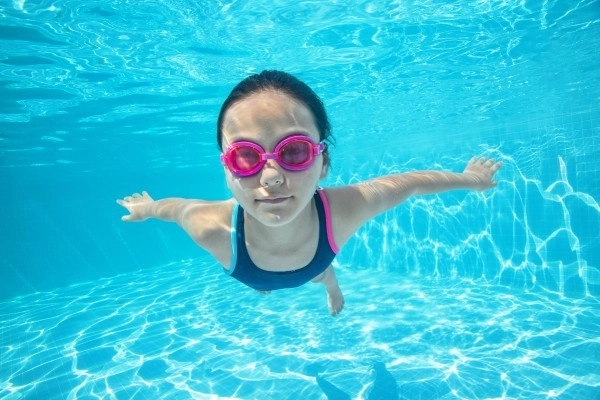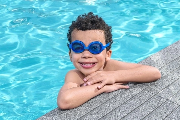 A polikarbonát lencsék UV-szűrővel csökkentik a vakítást, és védik a gyerekek szemét szabadtéri úszásnál és megvilágított medencékben is.