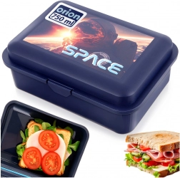 Stílusos és tartós uzsonnás doboz látványos űrmotívummal és SPACE felirattal, amely gyerekeknek és felnőtteknek egyaránt tetszeni fog. Az egyszerű, egy rekeszes kialakítás és a téglalap alak bőséges helyet kínál szendvicseknek, gyümölcsnek vagy más finomságoknak. A doboz könnyű, élelmiszerbiztonságos anyagokból készült, amelyek semlegesek az ételekkel, és megfelelnek az európai szabványoknak.