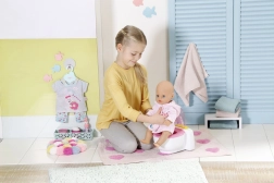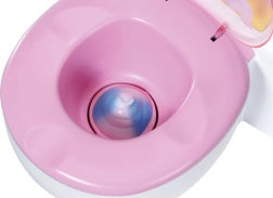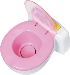A BABY born már bilire/WC-re jár! Amint leül a fehér trónjára rózsaszín ülőkével, hallani fogod a pisiléssel, tapssal és vidám nevetéssel járó hangokat. A BABY born kakilni is tud. Ilyenkor a csészében színes, csillogó kaki jelenik meg. Gyorsan, ideje lehúzni! Ha megnyomod az öblítő gombot, a kaki eltűnik, és hallani fogod az öblítés hangját.