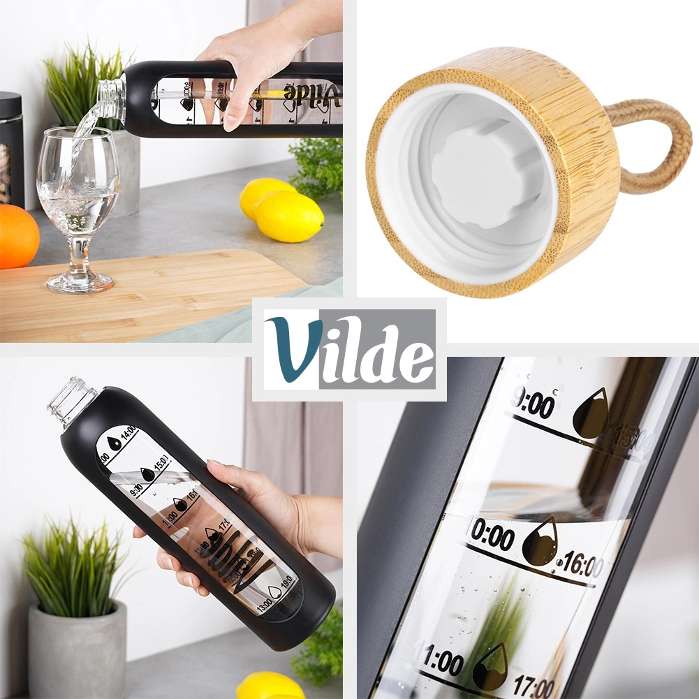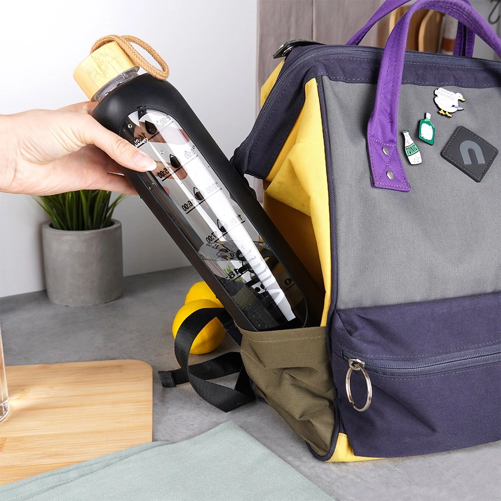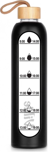 Stílusos, 1 literes üveg vizespalack bambusz tetővel és textil hurkokkal a kényelmes, környezetbarát mindennapi iváshoz. A védő szilikon borításnak köszönhetően ellenállóbb a töréssel szemben és jobb a fogása. Az oldalsó praktikus időbeosztás segít egész nap betartani a rendszeres folyadékbevitelt. A palack strapabíró boroszilikát üvegből készült, a szilikon tömítésnek köszönhetően szivárgásbiztos, és hideg és meleg italokhoz egyaránt alkalmas.